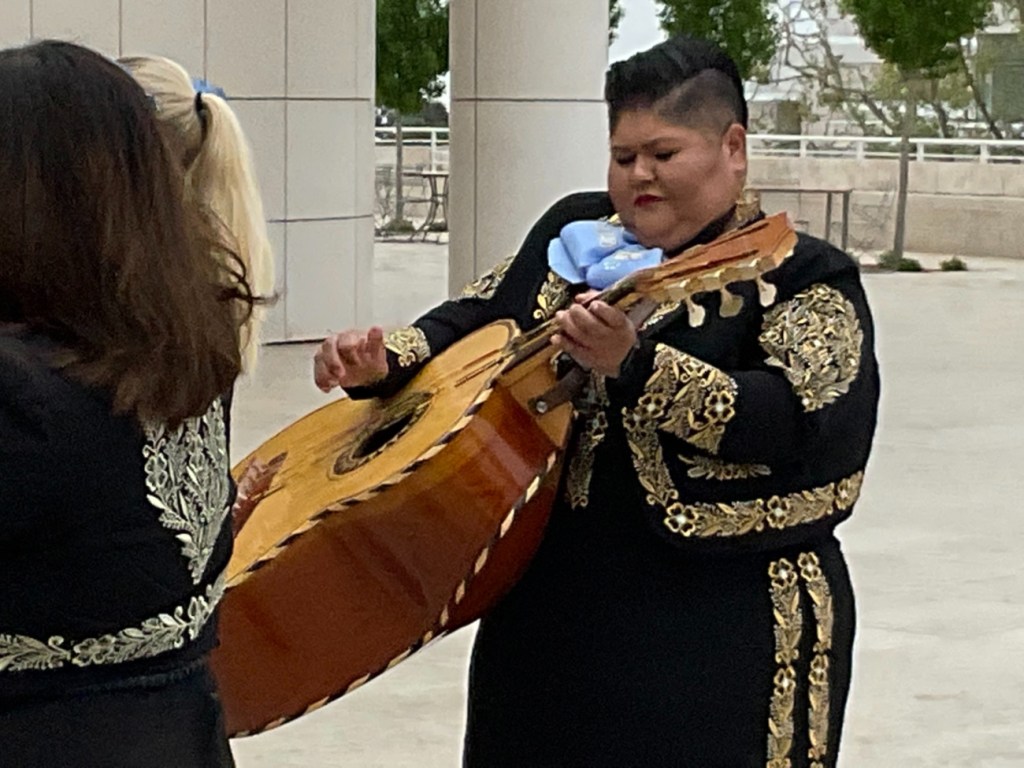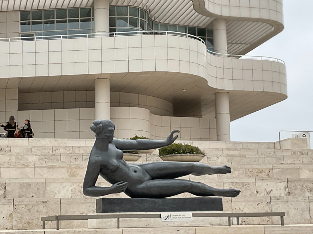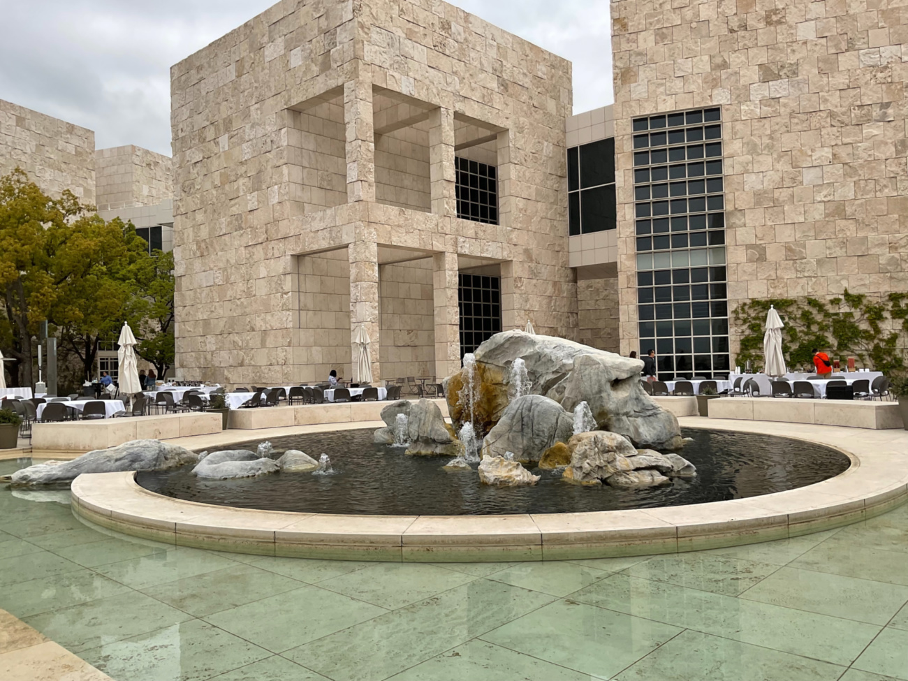 Acima, Mariachi no Getty Center, detalhe do hall e a escultura “L’Air”, de Aristide Maioll (1861-1944) nesse museu e complexo cultural localizado no bairro angelino de Brentwood; no alto à dir. e abaixo à esq., fachadas no Distrito dos Teatros (fotos Silvio Cioffi – V!VA)