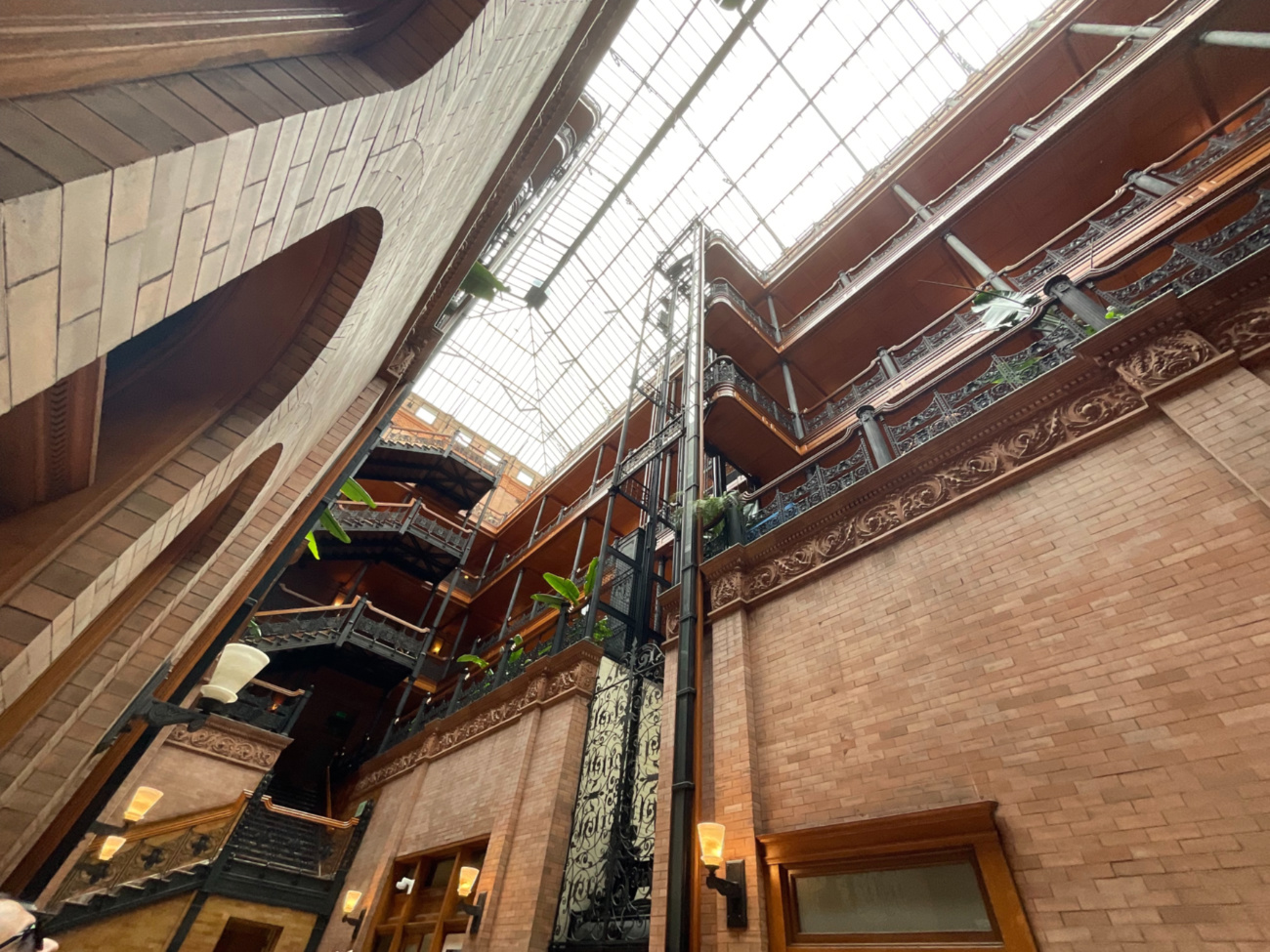 No alto à esq. e à dir., detalhe de quadro de Van Gogh (1853-1890) e de fonte no museu Getty Center; demais imagens do icônico prédio Bradburry, em downtown Los Angeles (fotos Silvio Cioffi – V!VA)