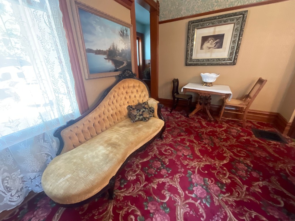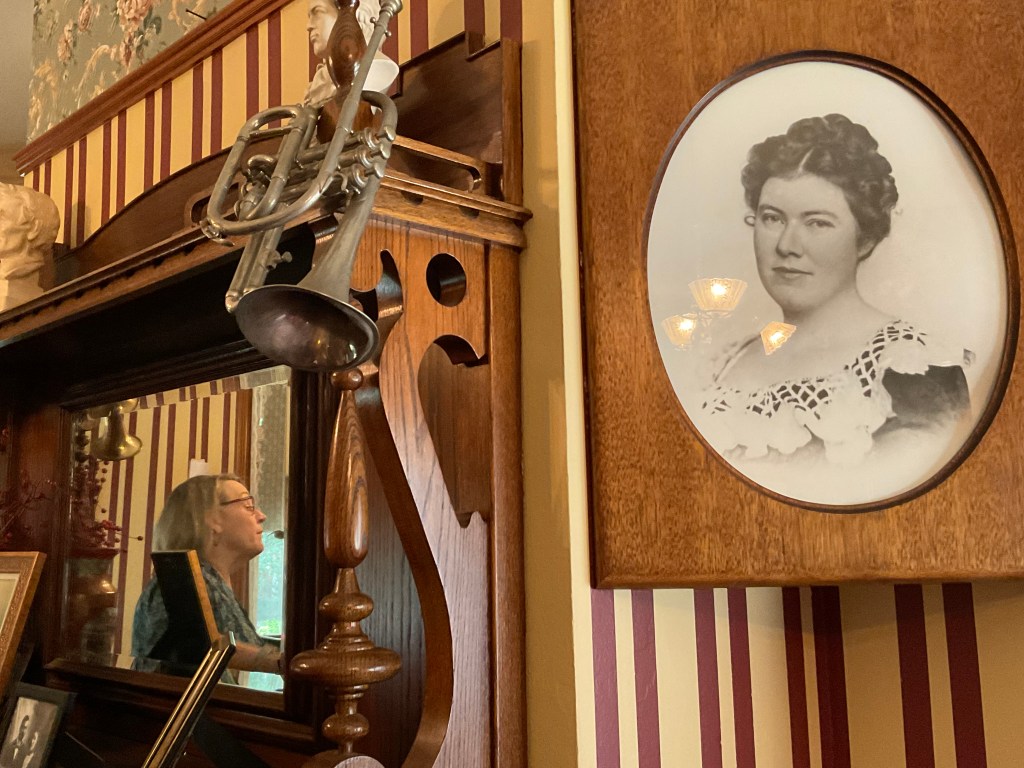 O charmoso bangalô de madeira em estilo vitoriano de três andares e repleto de fotos foiredecorado com mobiliário de época e rigor histórico.